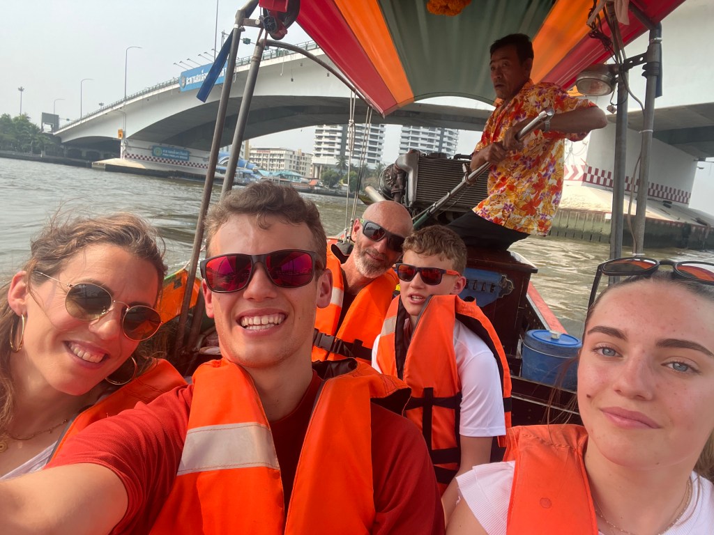 En sortant, bien repu d’un riz au poulet thaï et d’œufs frits, nous partons à la recherche d’un 7 eleven pour prendre une carte SIM. On arpente les rues et terminons dans un tuk tuk avec un chauffeur bien sympa qui nous dépose comme de bons touristes sur le bord du fleuve Chao Phraya chez un collègue à lui qui va nous vendre une ballade de 2h en bateau à longue queue – long tail boat – sur le Phraya et dans les Khlongs.